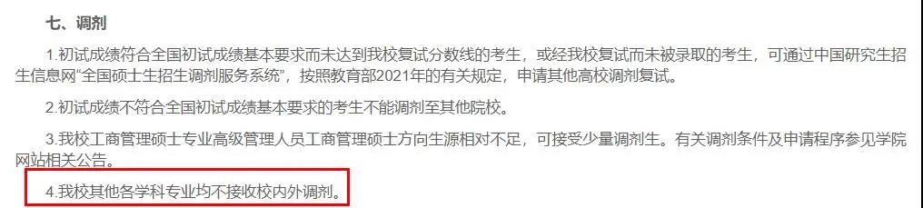 我校工商管理碩士專業(yè)高級管理人員工商管理碩士方向生源相對不足,可接受少量調(diào)劑生。有關(guān)調(diào)劑條件及申請程序參見學(xué)院網(wǎng)站相關(guān)公告。我校其他各學(xué)科專業(yè)均不接收校內(nèi)外調(diào)劑。