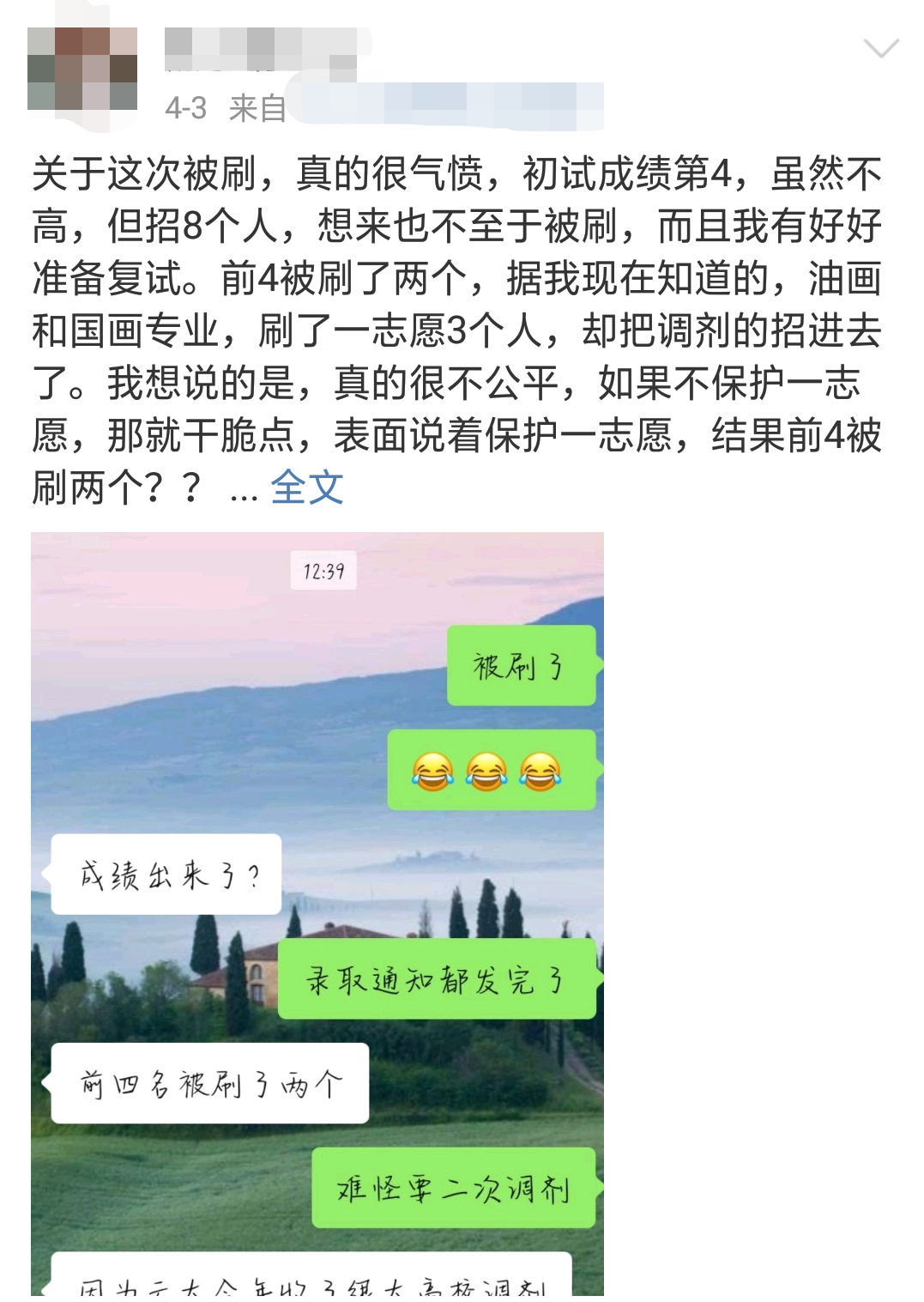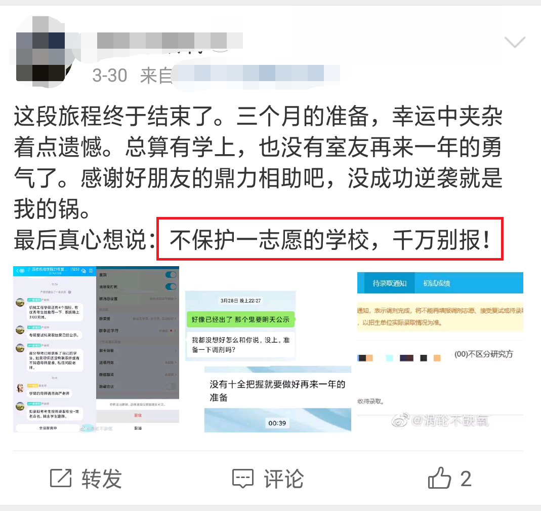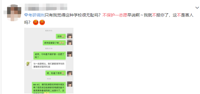 在網(wǎng)上看到很多這樣的帖子,飽受一志愿不被保護(hù)的苦。下面這位同學(xué)初試成績排名第4,院校的招生名額是8名,按道理來講被錄取的可能性非常大。然鵝,前四名被刷了2個(gè),招收了雙一流高校畢業(yè)的調(diào)劑生!