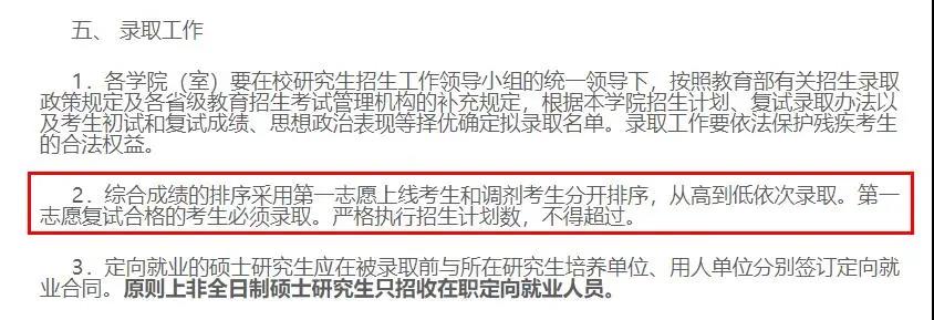 綜合成績的排序采用第一志愿上線考生和調(diào)劑考生分開排序,從高到低依次錄取。第一志愿復(fù)試合格的考生必須錄取。嚴(yán)格執(zhí)行招生計(jì)劃數(shù),不得超過。