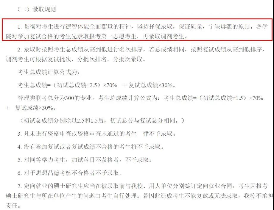 徹對考生進(jìn)行德智體能全面衡量的精神,堅(jiān)持擇優(yōu)錄取,保證質(zhì)量,寧缺毋濫的原則。各學(xué)院對參加復(fù)試合格的考生先錄取報(bào)考第一志愿考生,再錄取調(diào)劑考生。