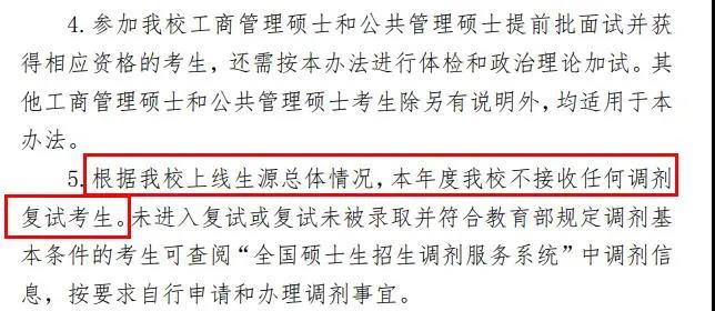 根據(jù)我校上線生源總體情況,本年度我校不接收任何調(diào)劑復(fù)試考生。未進(jìn)入復(fù)試或復(fù)試未被錄取并符合教育部規(guī)定調(diào)劑基本條件的考生可查閱“全國碩士生招生調(diào)劑服務(wù)系統(tǒng)”中調(diào)劑信息,按要求自行申請和辦理調(diào)劑事宜。