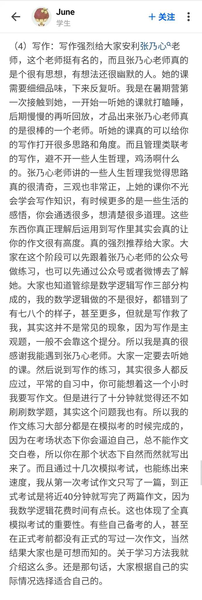 寫作:強(qiáng)烈安利名師張乃心,一定要去聽她的課,講課風(fēng)趣有深度,啟發(fā)考生哲學(xué)寫作思考;前期先跟著張老師的公眾號練習(xí),中間跟著聽課,后期做模擬題練速度。