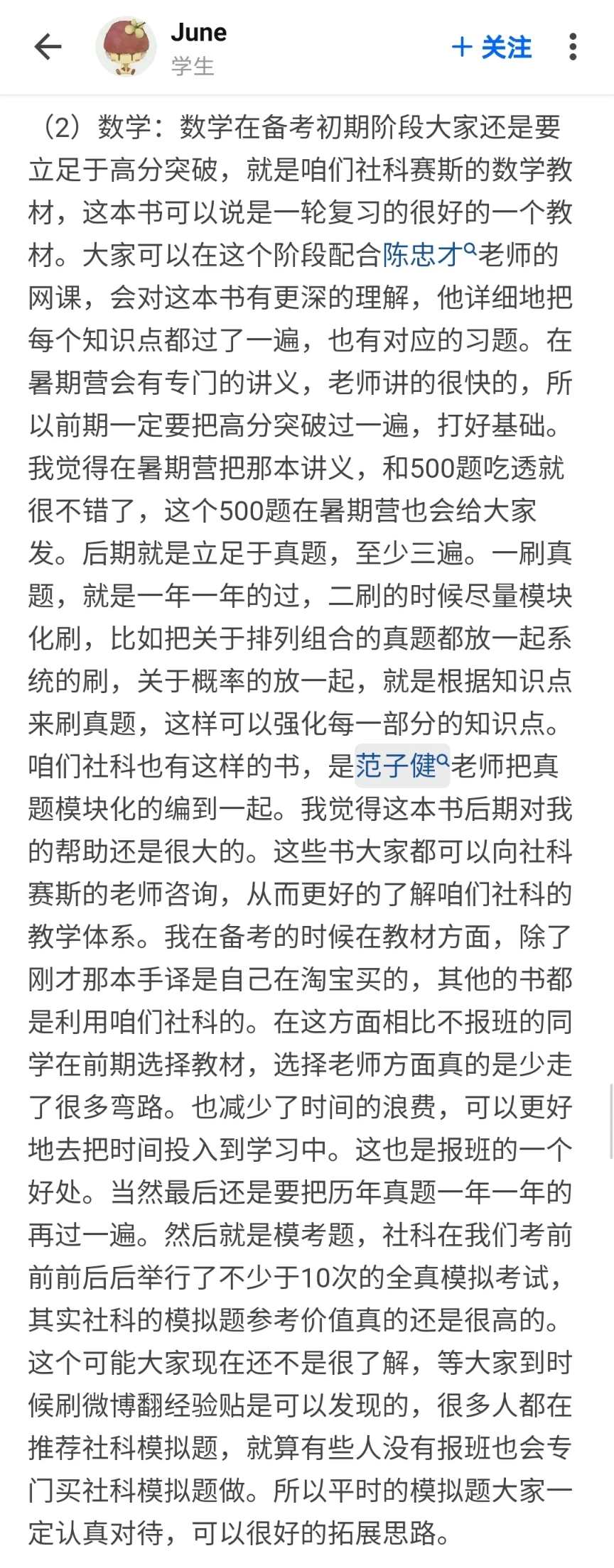 數(shù)學(xué):備考初期立足于社科數(shù)學(xué)教材——高分突破,配合陳忠才老師的網(wǎng)課,吃透社科的講義和500題;后期還是以真題為主,跟隨范子健老師進(jìn)行真題模塊化練習(xí);社科的模擬題參考價值很高,不論是報班還是購買,都需要重視。