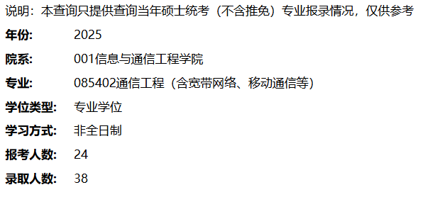 以上就是小編為大家整理的“2025考研報(bào)錄比:電子科技大學(xué)信息與通信工程學(xué)院2025年碩士研究生報(bào)考錄取情況(通信工程(含寬帶網(wǎng)絡(luò)、移動(dòng)通信等)專(zhuān)業(yè))”全部?jī)?nèi)容,最近會(huì)持續(xù)更新各院校新發(fā)布的報(bào)錄情況,希望對(duì)大家有所幫助,考研加油!