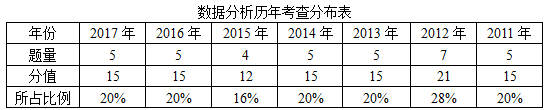 另外,小編仔細(xì)分析了2011年—2017年數(shù)據(jù)分析模塊的考查情況,相關(guān)數(shù)據(jù)整理如下表所示: