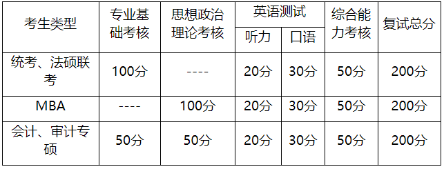 審計(jì)、會(huì)計(jì)專(zhuān)業(yè):復(fù)試成績(jī)=思想政理論考核+專(zhuān)業(yè)基礎(chǔ)考核+外語(yǔ)聽(tīng)力+外語(yǔ)口語(yǔ)+綜合能力考核。復(fù)試成績(jī)總分200分。