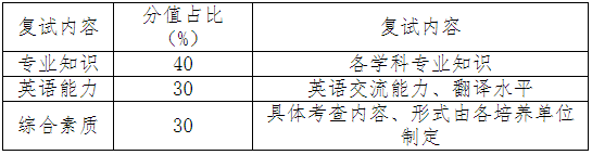 復(fù)試由各培養(yǎng)單位組織開展。復(fù)試主要是考核考生綜合運(yùn)用專業(yè)知識(shí)分析和解決問(wèn)題的能力、評(píng)判思維能力、舉止和語(yǔ)言表達(dá)能力、人文素養(yǎng)、心理素質(zhì)等,實(shí)行百分制計(jì)分,包括專業(yè)知識(shí)、英語(yǔ)能力、綜合素質(zhì)。具體各項(xiàng)賦值及復(fù)試內(nèi)容見下表。