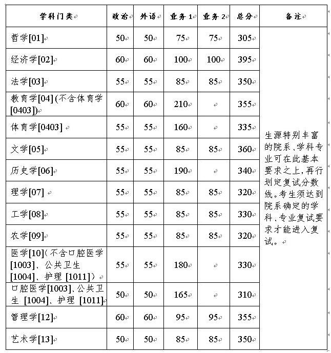 1.總分成績不低于上表中復試分數(shù)線基本要求的總分,滿分為100分的科目成績不低于50分,滿分為150分的科目成績不低于75分,滿分為200分的科目成績不低于100分,滿分為300分的科目成績不低于150分,符合上述條件的考生可參加退役大學生士兵專項計劃的復試。