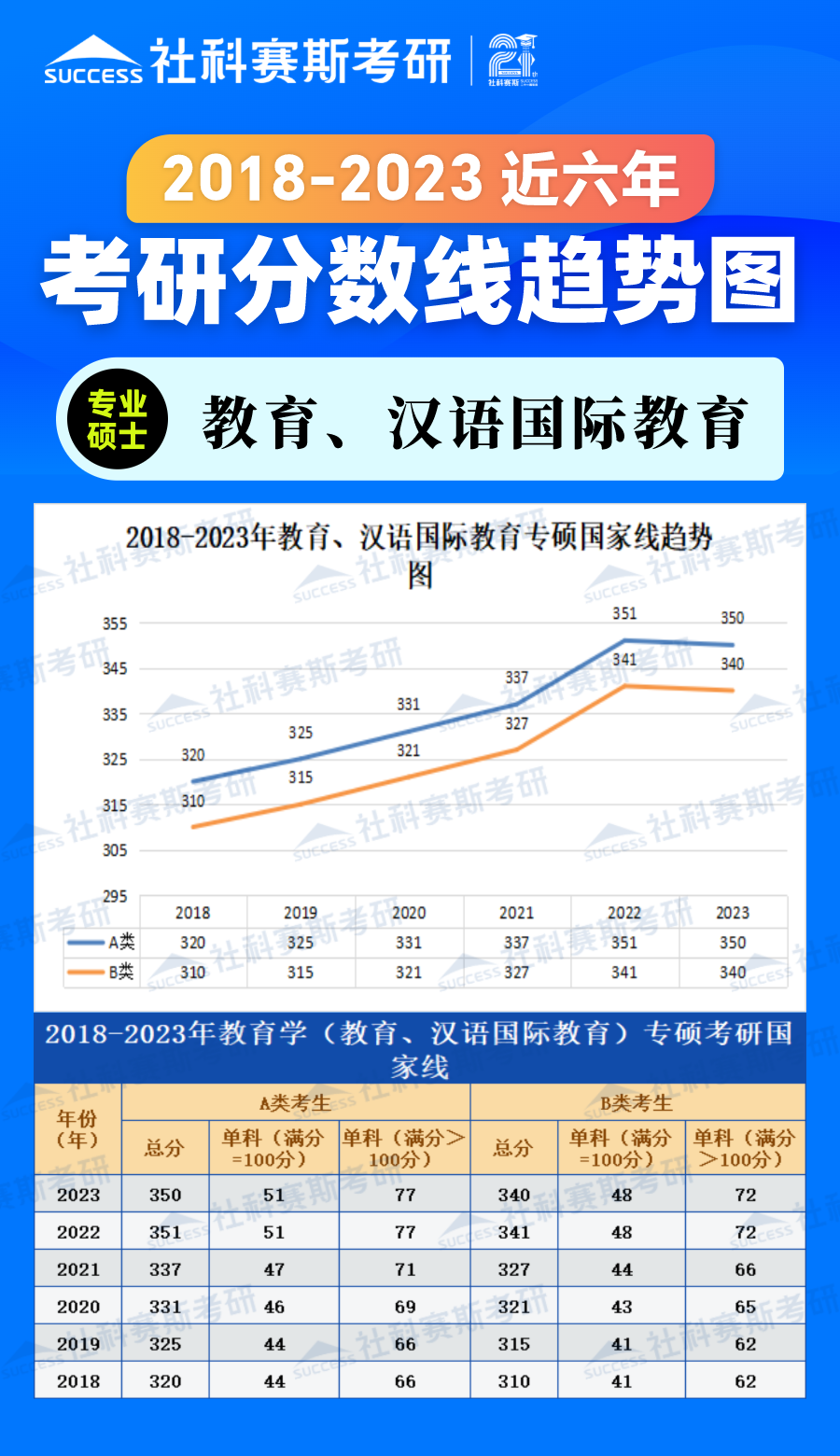 2023考研分?jǐn)?shù)線:2018-2023年教育、漢語國際教育專碩近六年考研分?jǐn)?shù)線趨勢(shì)圖
