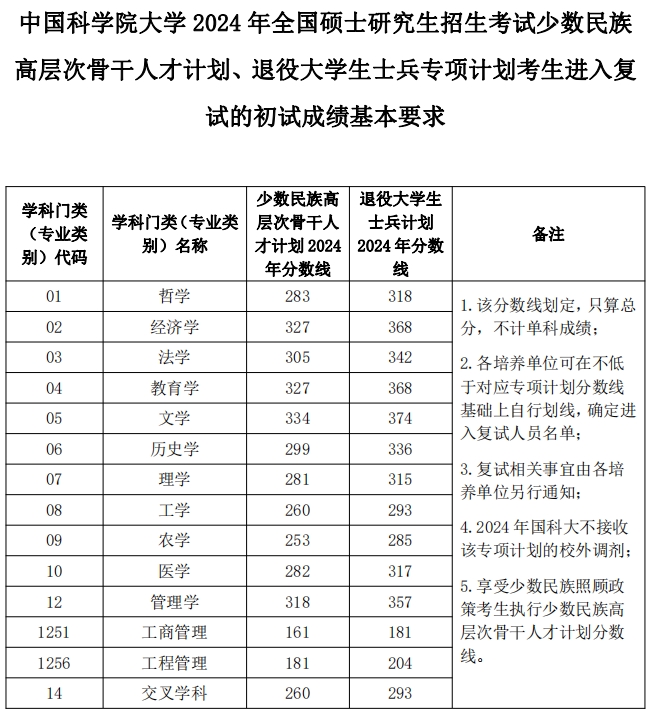 2024考研分?jǐn)?shù)線:中國(guó)科學(xué)院大學(xué)2024年全國(guó)碩士研究生招生考試少數(shù)民族高層次骨干人才計(jì)劃、退役大學(xué)生士兵專(zhuān)項(xiàng)計(jì)劃考生進(jìn)入復(fù)試的初試成績(jī)基本要求