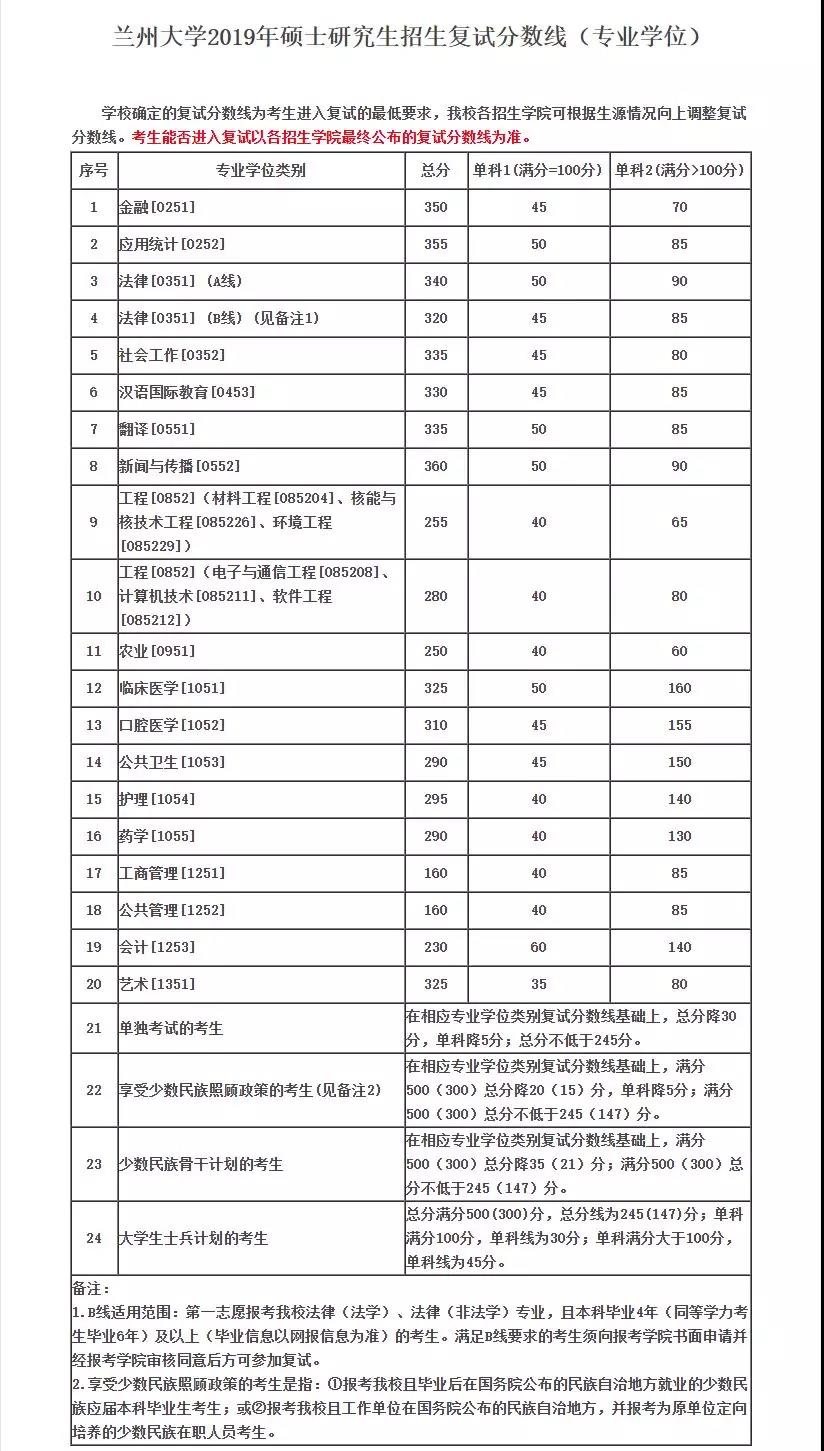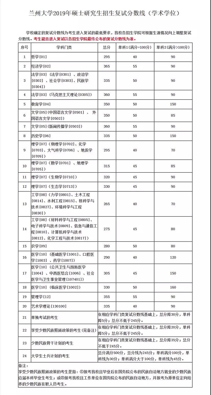 以下為蘭州大學(xué)2019年碩士研究生招生復(fù)試分?jǐn)?shù)線(學(xué)術(shù)學(xué)位和專業(yè)學(xué)位):