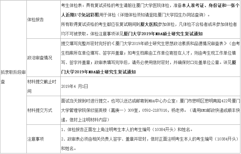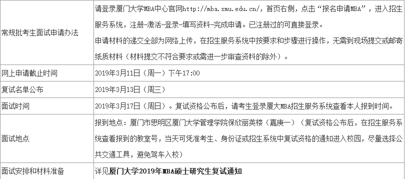 2、參加2019年預(yù)審面試并獲得優(yōu)秀或良好資格的考生,請(qǐng)參看廈門大學(xué)2019年入學(xué)MBA預(yù)審面試考生須知。