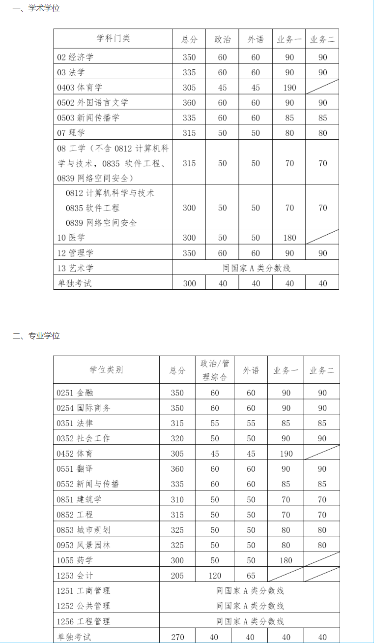 | 學(xué)位類別 | 總分 | 政治 | 外語 | 業(yè)務(wù)一 | 業(yè)務(wù)二 |