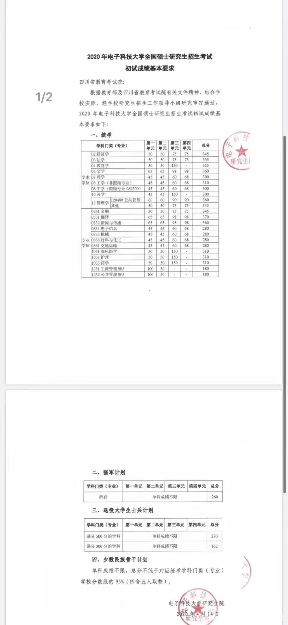 2020考研分?jǐn)?shù)線:電子科技大學(xué)2020年碩士研究生復(fù)試基本分?jǐn)?shù)線公布!