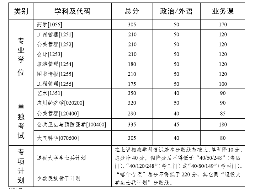3. 工商管理[1251]、公共管理[1252]、會(huì)計(jì)[1253]、旅游管理[1254]、 圖書情報(bào)[1255]等五個(gè)專業(yè)通過提前面試的考生,適用國家 A 類線 (175/44/88)。復(fù)試及錄取要求參見相關(guān)招生單位規(guī)定。