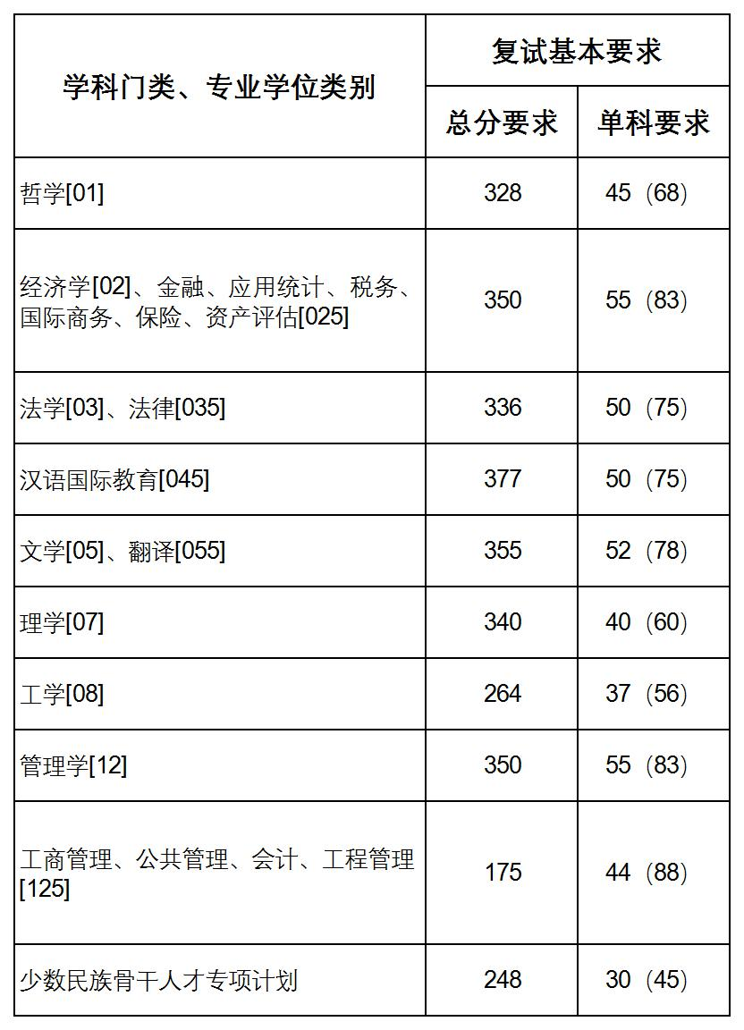 上述基本要求為我校各學科門類或?qū)I(yè)學位的最低復試要求。各學院(所)將在學校公布的初試成績基本要求基礎上,根據(jù)本學院(所)各專業(yè)招生計劃和具體考試情況確定各專業(yè)復試分數(shù)線,并在我校研究生招生管理信息系統(tǒng)中陸續(xù)公布。
