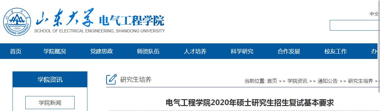 2020考研分數(shù)線:山東大學電氣工程學院2020年碩士研究生招生考試復試基本分數(shù)線公布