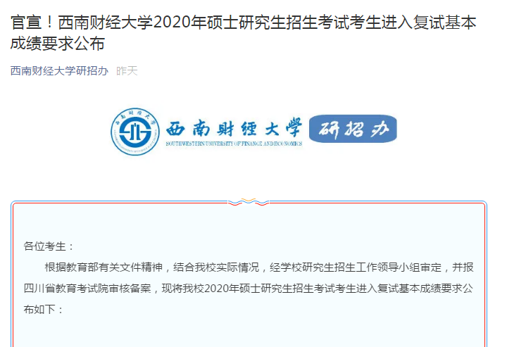 繼2020考研國家線公布后,34所自主劃線院校和各大院校也陸續(xù)公布2020年復(fù)試分?jǐn)?shù)線。西南財(cái)經(jīng)大學(xué)已經(jīng)公布2020年碩士研究生入學(xué)考試復(fù)試基本分?jǐn)?shù)線,如下所示: