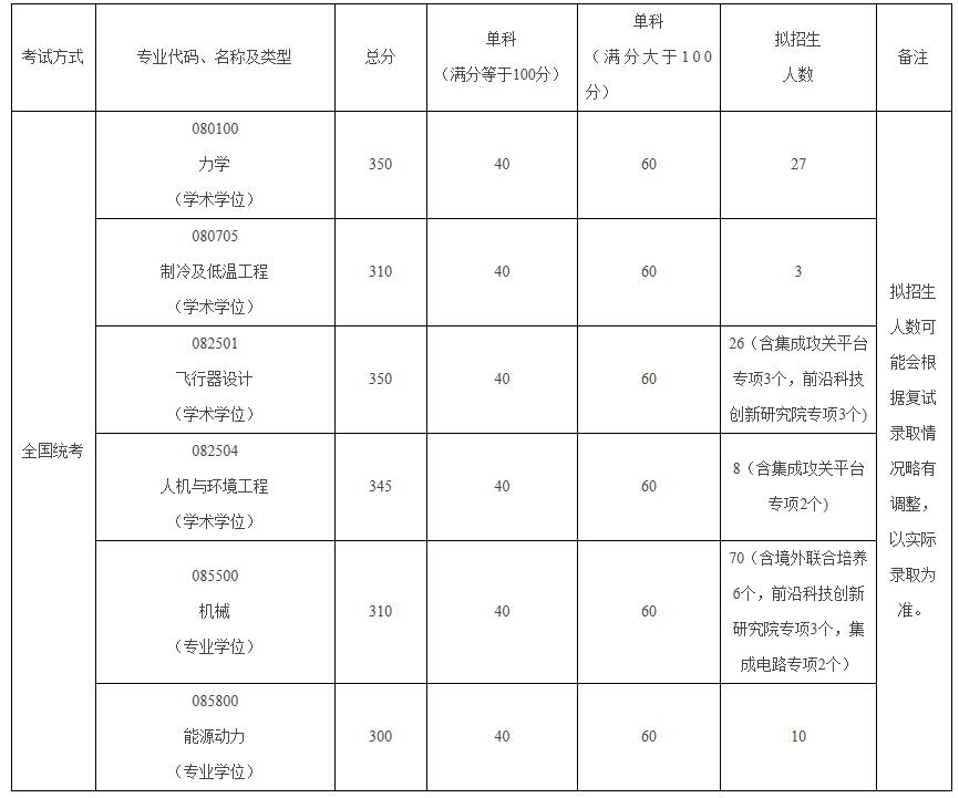2.   我院080100力學(xué)、080705制冷及低溫工程、082501飛行器設(shè)計、082504人機與環(huán)境工程、085800能源動力等專業(yè)復(fù)試實行按專業(yè)和研究方向分組復(fù)試。