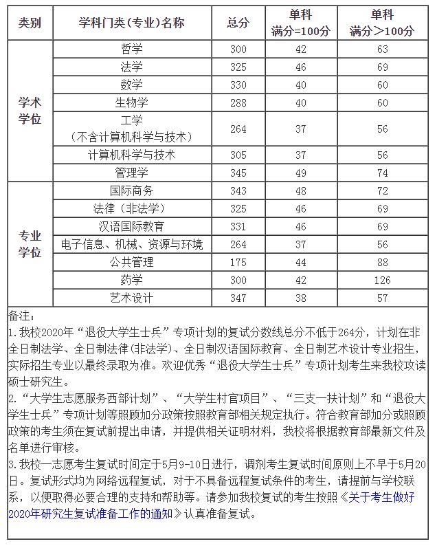 根據(jù)教育部《2020年全國(guó)碩士研究生招生考試考生進(jìn)入復(fù)試的初試成績(jī)基本要求》,經(jīng)學(xué)校研究生招生工作領(lǐng)導(dǎo)小組研究決定,我校(含中國(guó)計(jì)量大學(xué)義烏研究生院)2020年碩士研究生進(jìn)入復(fù)試的初試成績(jī)基本要求按國(guó)家A類考生分?jǐn)?shù)線執(zhí)行,一志愿生源充足的招生學(xué)院可適當(dāng)提高分?jǐn)?shù)線,具體如下。