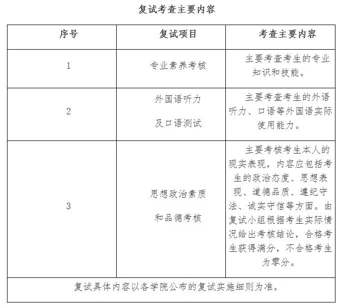 2.復(fù)試主要包括三項(xiàng)內(nèi)容,即專(zhuān)業(yè)素養(yǎng)考核、外國(guó)語(yǔ)聽(tīng)力及口語(yǔ)測(cè)試、思想政治素質(zhì)和品德考核。同時(shí),通過(guò)考生大學(xué)學(xué)習(xí)成績(jī)單、畢業(yè)論文、科研成果、專(zhuān)家推薦信等補(bǔ)充材料,加強(qiáng)對(duì)考生既往學(xué)業(yè)、一貫表現(xiàn)、科研能力、綜合素質(zhì)和思想品德等情況的全面考查。