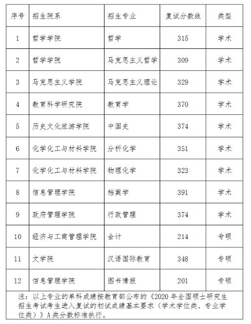 3.根據(jù)我校一志愿上線(xiàn)人數(shù),除以下專(zhuān)業(yè)外,我校其他專(zhuān)業(yè)的復(fù)試分?jǐn)?shù)線(xiàn)均采用教育部公布的《2020年全國(guó)碩士研究生招生考試考生進(jìn)入復(fù)試的初試成績(jī)基本要求(學(xué)術(shù)學(xué)位類(lèi)、專(zhuān)業(yè)學(xué)位類(lèi))》A類(lèi)分?jǐn)?shù)標(biāo)準(zhǔn)。