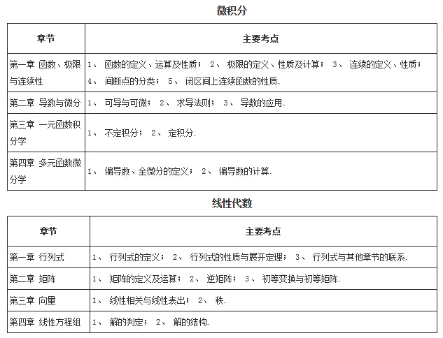 一元函數(shù)的微分、積分;多元函數(shù)的一階偏導(dǎo)數(shù);函數(shù)的單調(diào)性和極值。