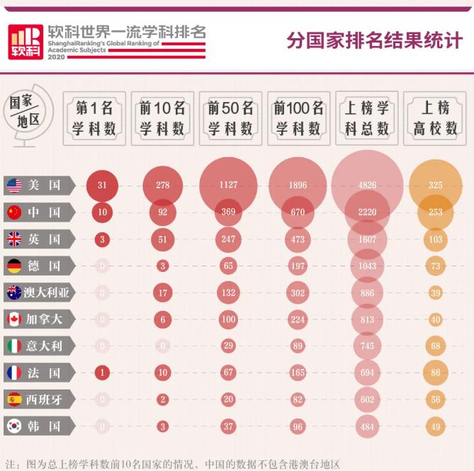 2020軟科世界一流學科排名分國家排名結果統(tǒng)計