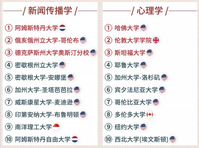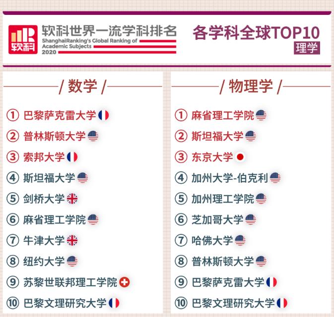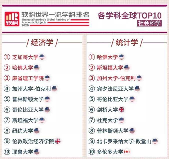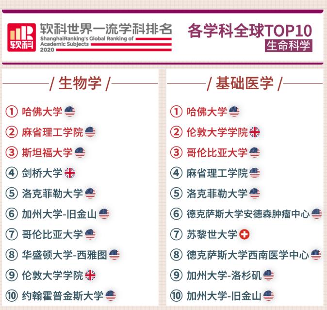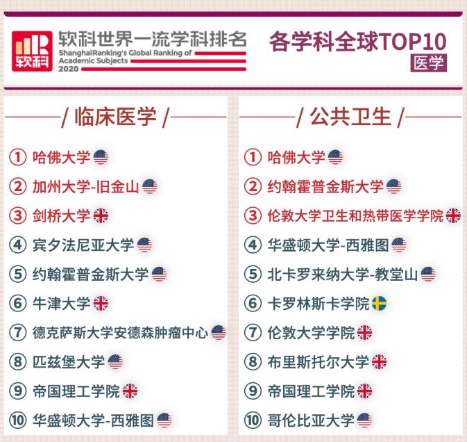 2020軟科世界一流學科排名54個學科全球TOP10高校