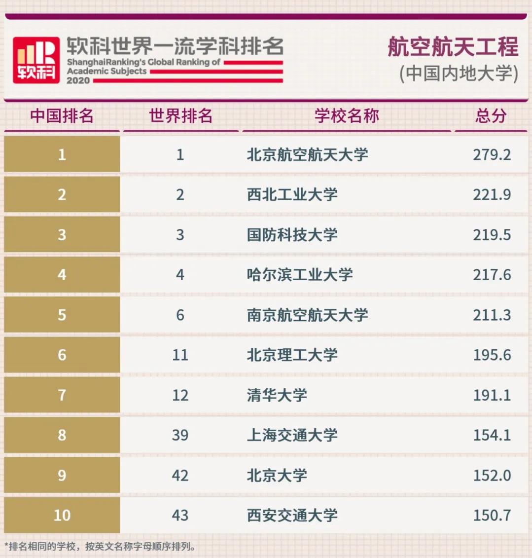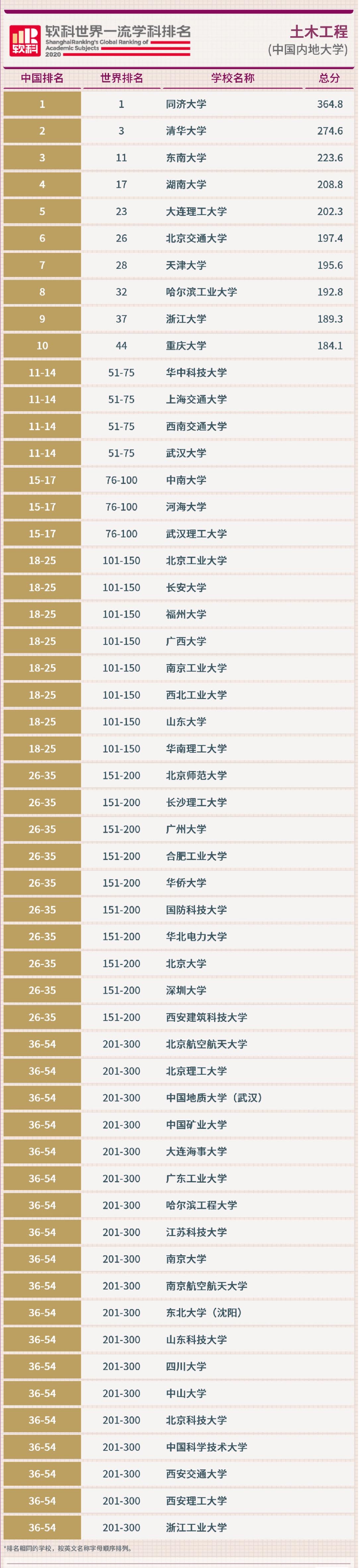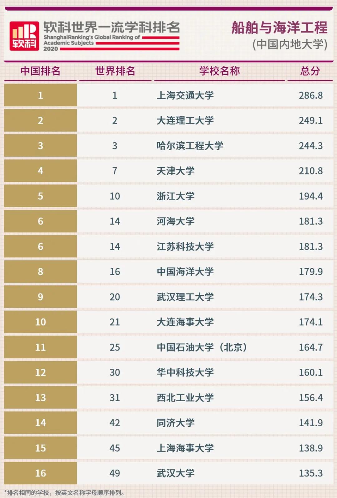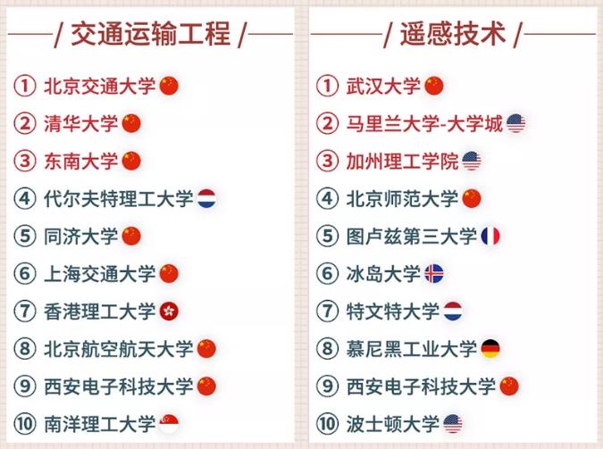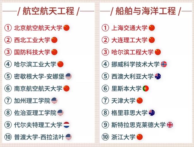 2020軟科世界一流學科排名中,中國內(nèi)地高校表現(xiàn)強勁,在10個學科奪得世界第一,分別是清華大學(通信工程)、哈爾濱工業(yè)大學(儀器科學)、同濟大學(土木工程)、上海交通大學(船舶與海洋工程)、武漢大學(遙感技術)、北京科技大學(冶金工程)、北京航空航天大學(航空航天工程)、北京交通大學(交通運輸工程)、江南大學(食品科學與工程)和中南大學(礦業(yè)工程)。