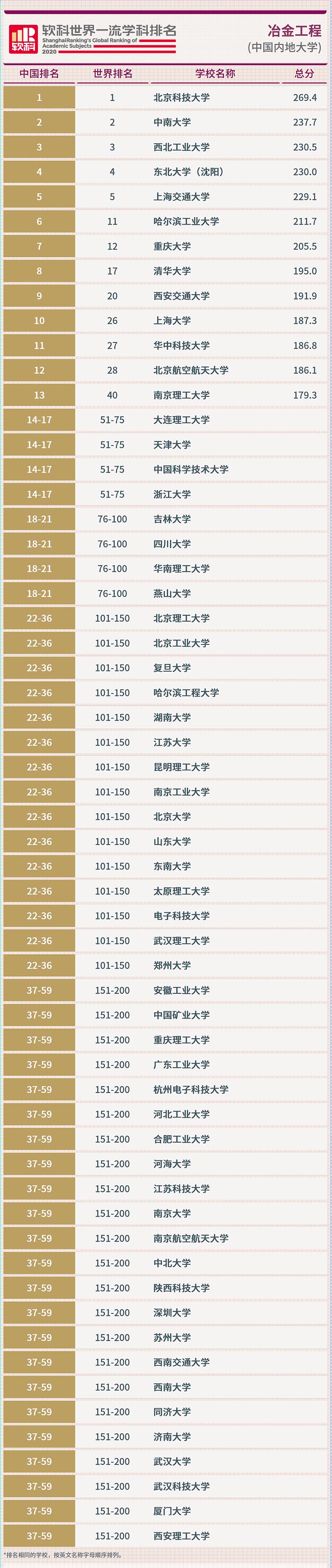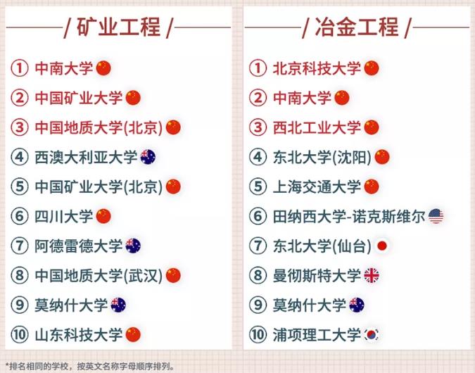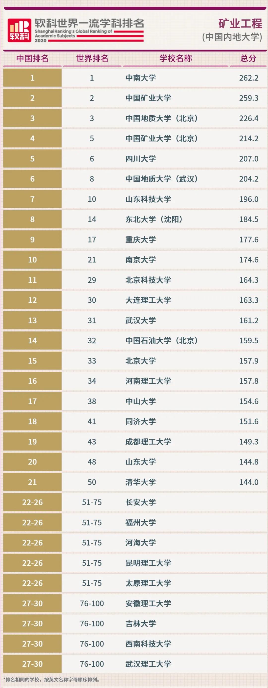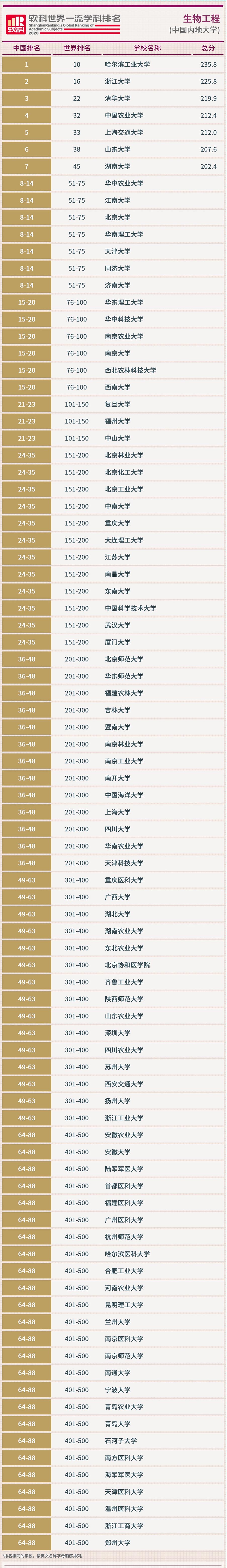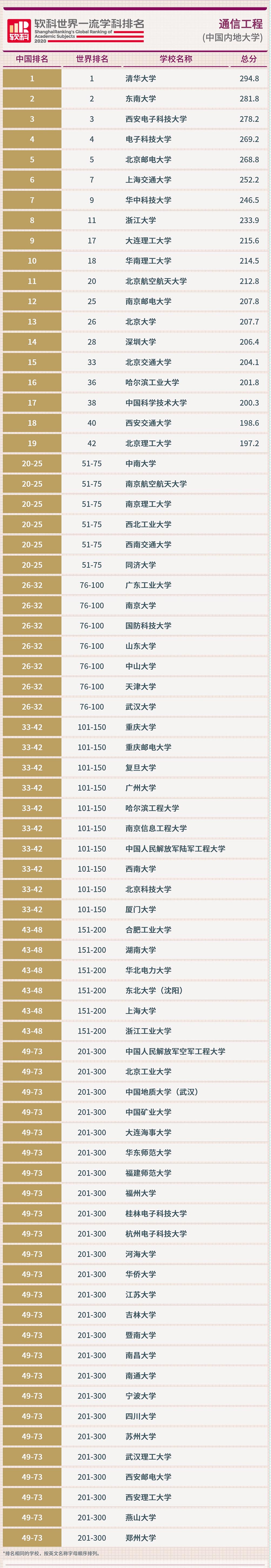 2020軟科世界一流學科排名中,中國內(nèi)地高校表現(xiàn)強勁,在10個學科奪得世界第一,分別是清華大學(通信工程)、哈爾濱工業(yè)大學(儀器科學)、同濟大學(土木工程)、上海交通大學(船舶與海洋工程)、武漢大學(遙感技術)、北京科技大學(冶金工程)、北京航空航天大學(航空航天工程)、北京交通大學(交通運輸工程)、江南大學(食品科學與工程)和中南大學(礦業(yè)工程)。
