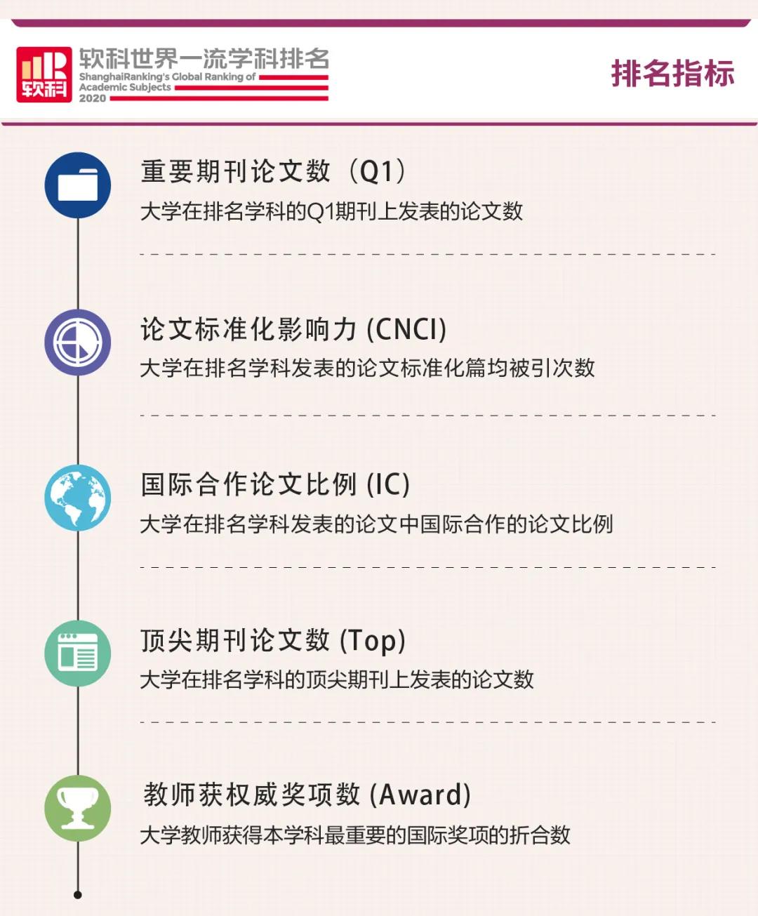 “軟科世界一流學科排名”使用一系列國際可比的客觀學術指標對全球大學在相關學科的表現(xiàn)進行測量,包括學科國際權威獎項、學科頂尖成果、科研質量、國際合作等。2020年,軟科對評價體系進行了優(yōu)化,使用“重要期刊論文數(shù)(Q1)”代替原“論文總數(shù)(PUB)”,用于測量被評價大學在相應學科的高水平科研產(chǎn)出。