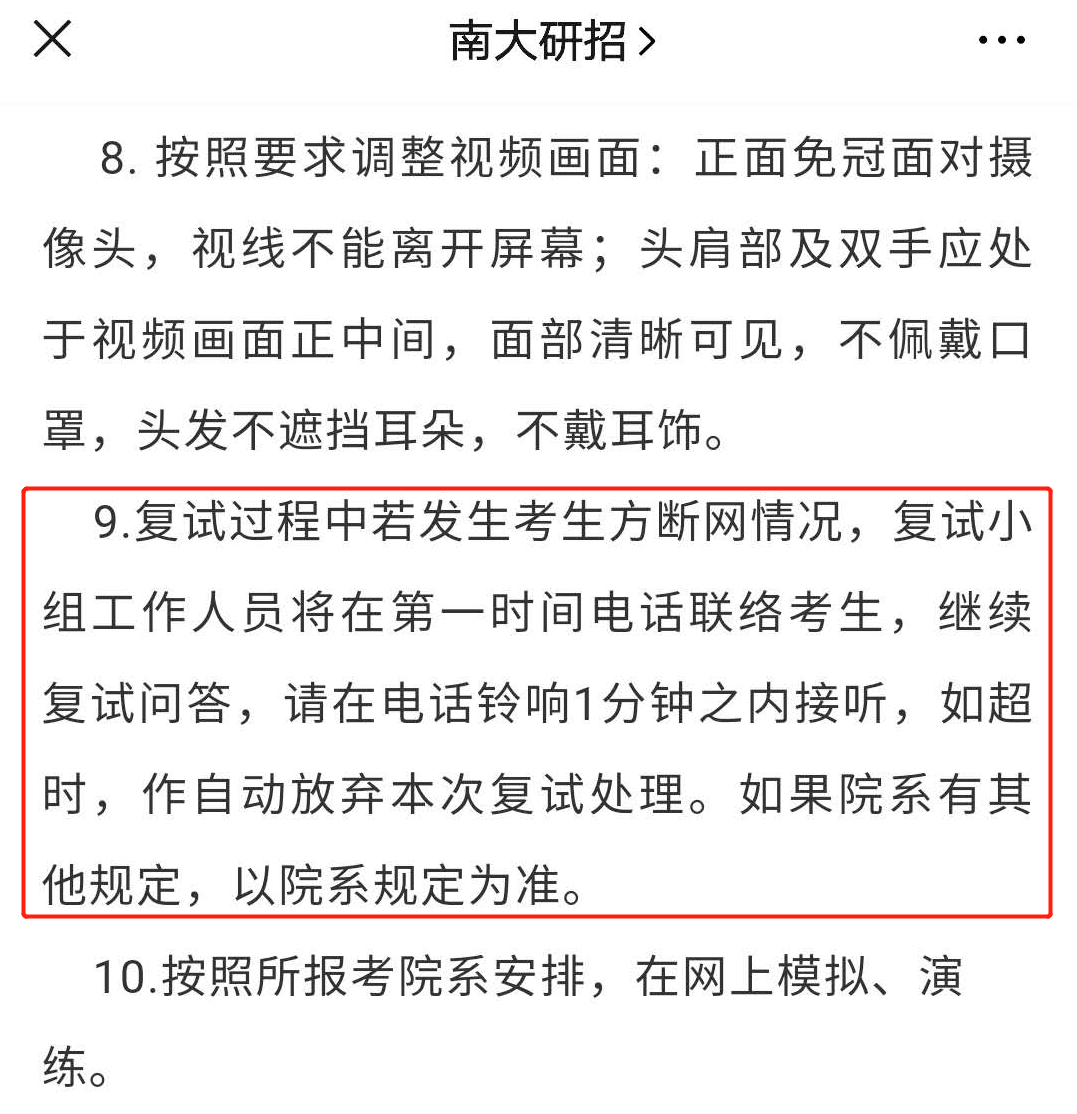 線上復(fù)試時,網(wǎng)絡(luò)是個關(guān)鍵點,中斷會影響考試進(jìn)度,有些學(xué)校會相當(dāng)嚴(yán)格,比如南開大學(xué)去年要求考生在斷網(wǎng)后1分鐘要取得聯(lián)系,否則視為自動放棄!