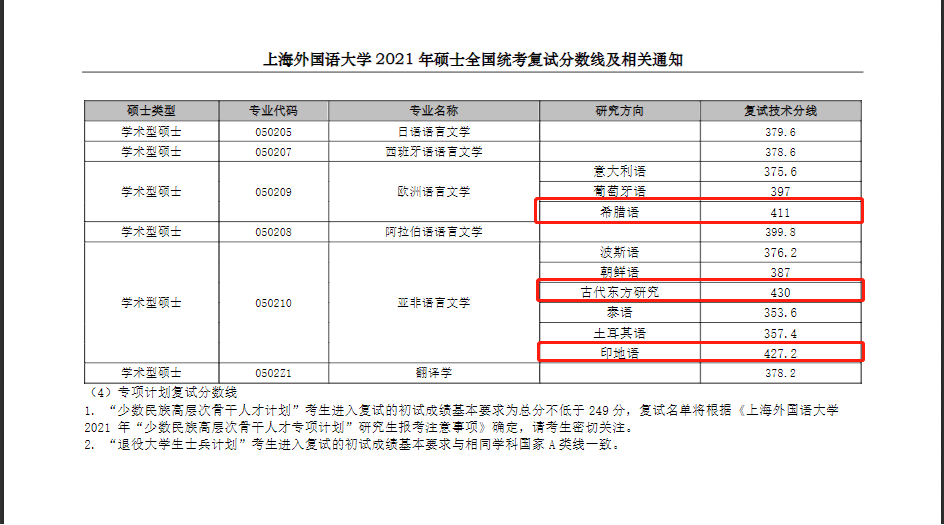 在《上海外國語大學(xué)2021年碩士全國統(tǒng)考復(fù)試分?jǐn)?shù)線相關(guān)通知》中可以看到,今年其學(xué)術(shù)型碩士歐洲語言文學(xué)(希臘語)411分、亞非語言文學(xué)的古代東方研究430分、印地語427.2分。