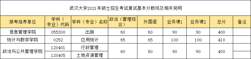 在《武漢大學(xué)2021年碩士招生考試復(fù)試基本分?jǐn)?shù)線及相關(guān)說明》中可以看到,今年其出版、行政管理、土地資源管理復(fù)試線均為400分,應(yīng)用統(tǒng)計高達(dá)410分!
