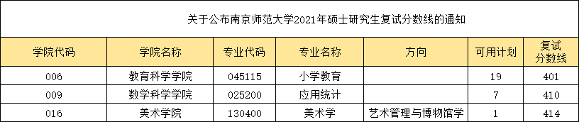 在《關(guān)于公布南京師范大學(xué)2021年碩士研究生復(fù)試分?jǐn)?shù)線的通知》中可以看到,今年其教育教學(xué)學(xué)小學(xué)教育(401分)、數(shù)學(xué)科學(xué)學(xué)院-應(yīng)用統(tǒng)計專業(yè)(400分)及美術(shù)學(xué)院-美術(shù)學(xué)專業(yè)(414分)。
