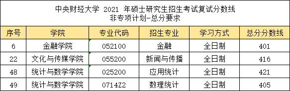 分?jǐn)?shù)線》中可以看到,金融學(xué)院-金融專業(yè)的復(fù)試分?jǐn)?shù)線為401分;文化與傳媒學(xué)院-新聞與傳播專業(yè)復(fù)試線為416分;統(tǒng)計與數(shù)學(xué)學(xué)院-應(yīng)用統(tǒng)計專業(yè)和數(shù)理統(tǒng)計專業(yè)復(fù)試線也均在400分以上。
