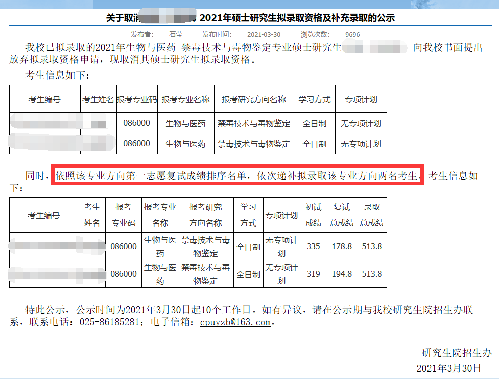 中國(guó)藥科大學(xué)生物與醫(yī)藥專業(yè)2名同學(xué)書面提出放棄擬錄取資格申請(qǐng),依照該專業(yè)方向第一志愿復(fù)試成績(jī)排序名單,依次遞補(bǔ)擬錄取該專業(yè)方向兩名考生。