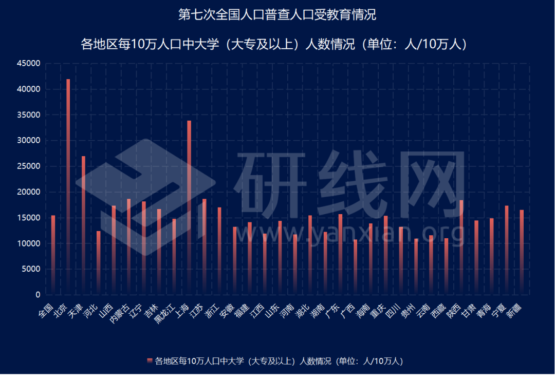 全國(guó)范圍內(nèi),考研競(jìng)爭(zhēng)最激烈的當(dāng)屬北京與上海。在這次的人口普查受教育情況中,兩地的情況也明顯超出其他地區(qū)。