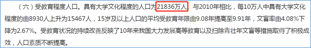 雖然大學(xué)文化程度人口的繼續(xù)增長(zhǎng)已屬意料之內(nèi),但“平均每7個(gè)人中就有1人是大學(xué)生”這一數(shù)據(jù)還是震驚到我了。要知道,在2000年的第五次全國(guó)人口普查中,每10萬(wàn)人中大學(xué)文化程度人口還僅有3611人。