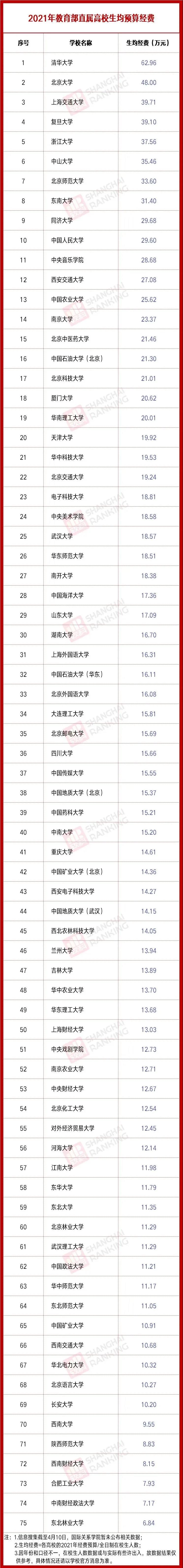 在這個排行榜里,生均經(jīng)費排名前三的是清華大學、北京大學和上海交通大學,不過最終也要看學校的人數(shù)多少,分攤下來再說多少。