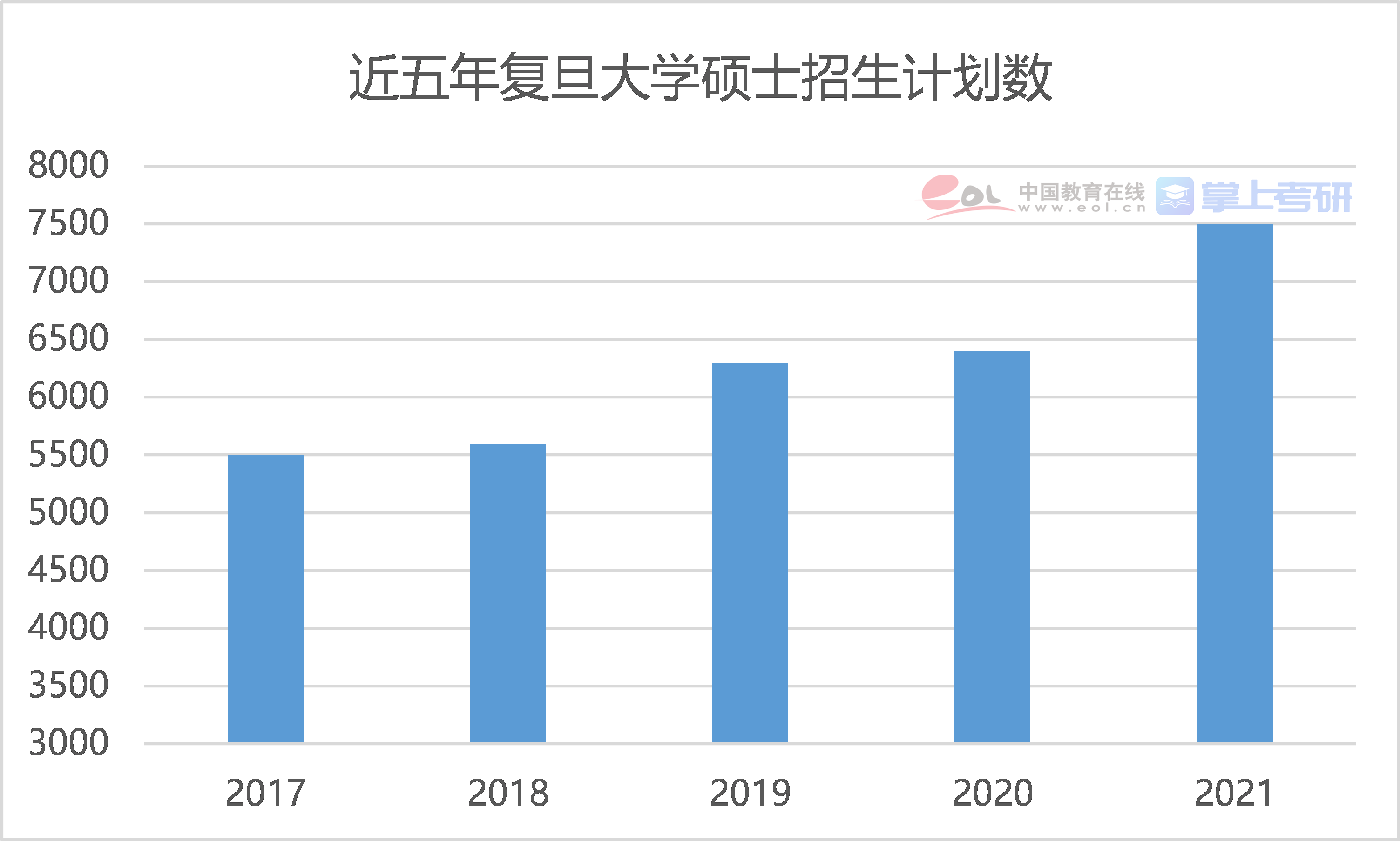 復旦大學2017至2021年招生規(guī)模也在持續(xù)增長,2021年招生計劃數(shù)達到7500人,較2020年大幅增加1100人,較2017年增加2000人。