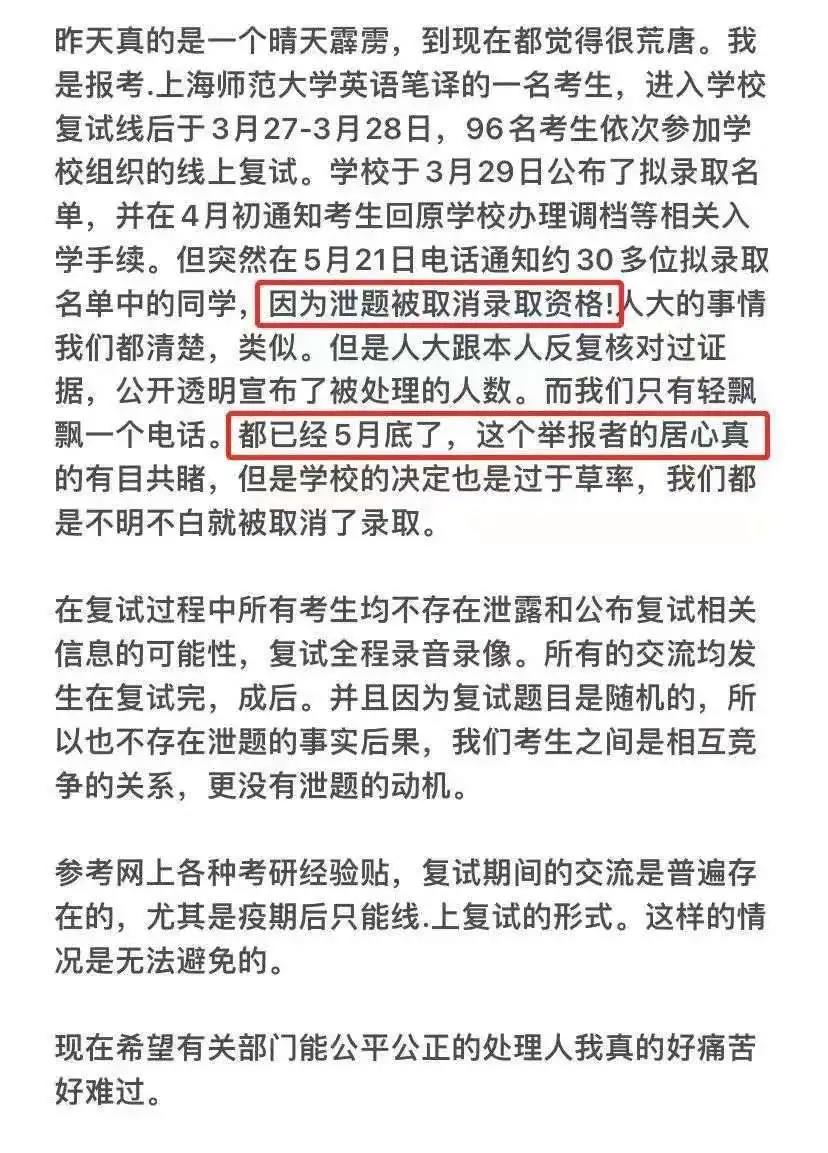 5月21日,上海師范大學接到舉報,致電取消了30多名考生的入學資格,導致考生強烈不滿發(fā)文網上求助。