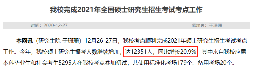 文章稱(chēng):我校碩士研究生報(bào)考人數(shù)繼續(xù)增加,達(dá)12351人,同比增長(zhǎng)20.9%。