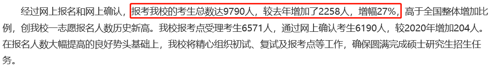 文中稱(chēng):經(jīng)過(guò)網(wǎng)上報(bào)名和網(wǎng)上確認(rèn),報(bào)考我校的考生總數(shù)達(dá)9790人,較去年增加了2258人,增幅27%。