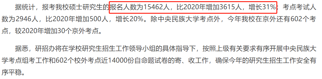 文中稱(chēng):據(jù)統(tǒng)計(jì),報(bào)考我校碩士研究生的報(bào)名人數(shù)為15462人,比2020年增加3615人,增長(zhǎng)31%。