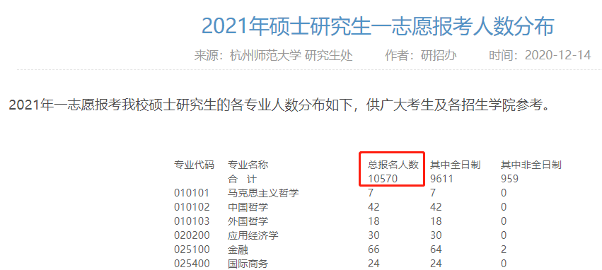 2020年12月14日,杭州師范大學(xué)研究生院發(fā)布《2021年碩士研究生一志愿報(bào)考人數(shù)分布》。