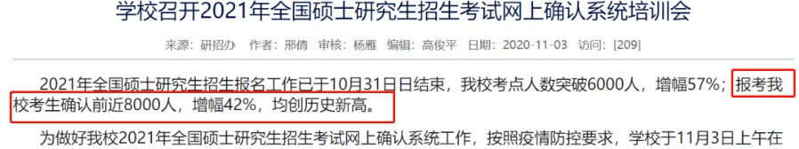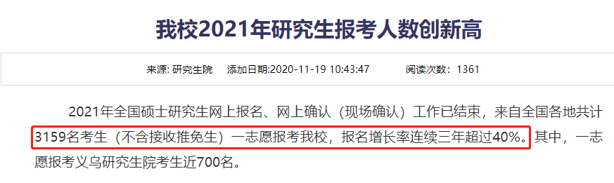 2020年11月19日,中國(guó)計(jì)量大學(xué)新聞網(wǎng)發(fā)布《我校2021年研究生報(bào)考人數(shù)創(chuàng)新高》。