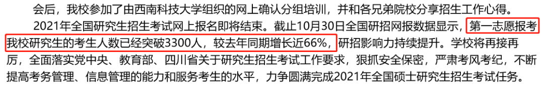 文中稱(chēng):2021年第一志愿報(bào)考成都大學(xué)研究生的考生人數(shù)已經(jīng)突破3300人,較去年同期增長(zhǎng)近66%。