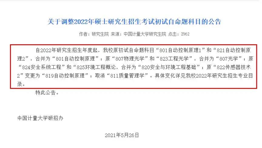 中國計(jì)量大學(xué)初試自命題科目有所變更:
